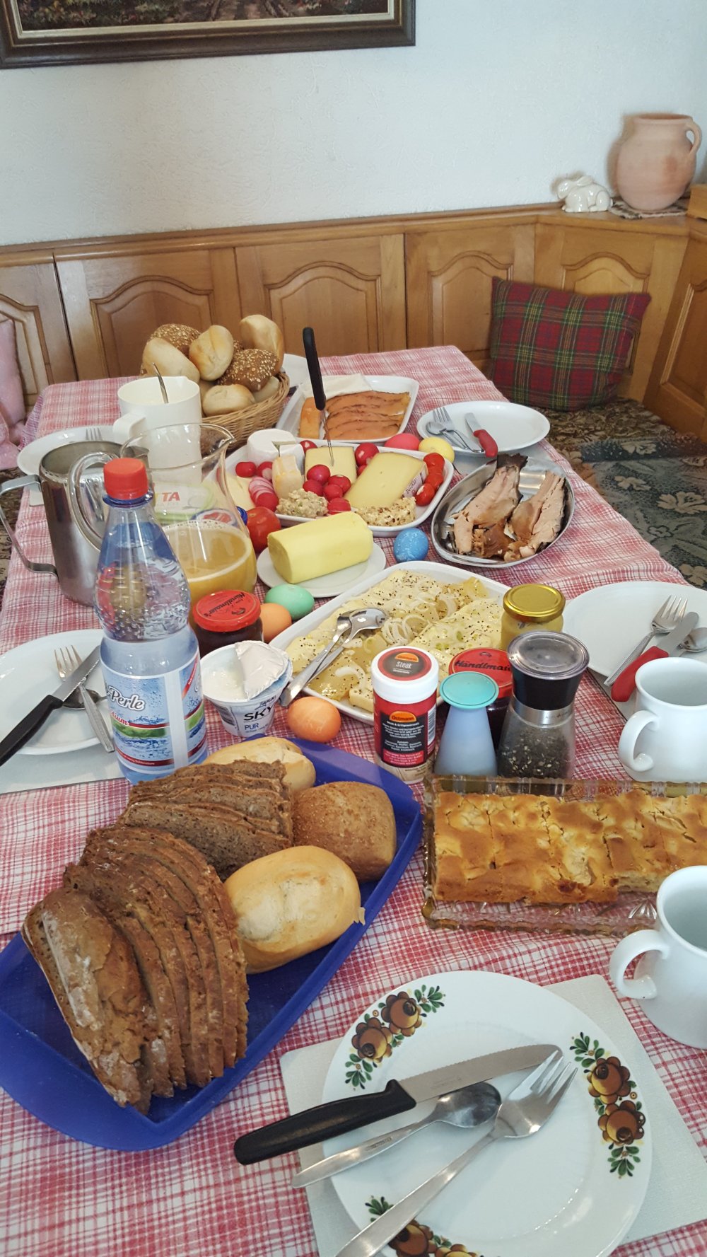 絞りたての新鮮なミルクと、さっき庭鳥小屋からとってきて茹でた卵、自家製パンにアップケーキというかなり豪華なブランチをいただきました。