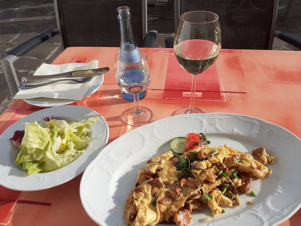 レストランは、惜しい!でもひょっとすると肉料理はおいしいかも、ここフランケンだし。滅多にお酒は飲まないけど今日はリースリングの地ワインを頂きました。きのこのオムレツと一緒に。