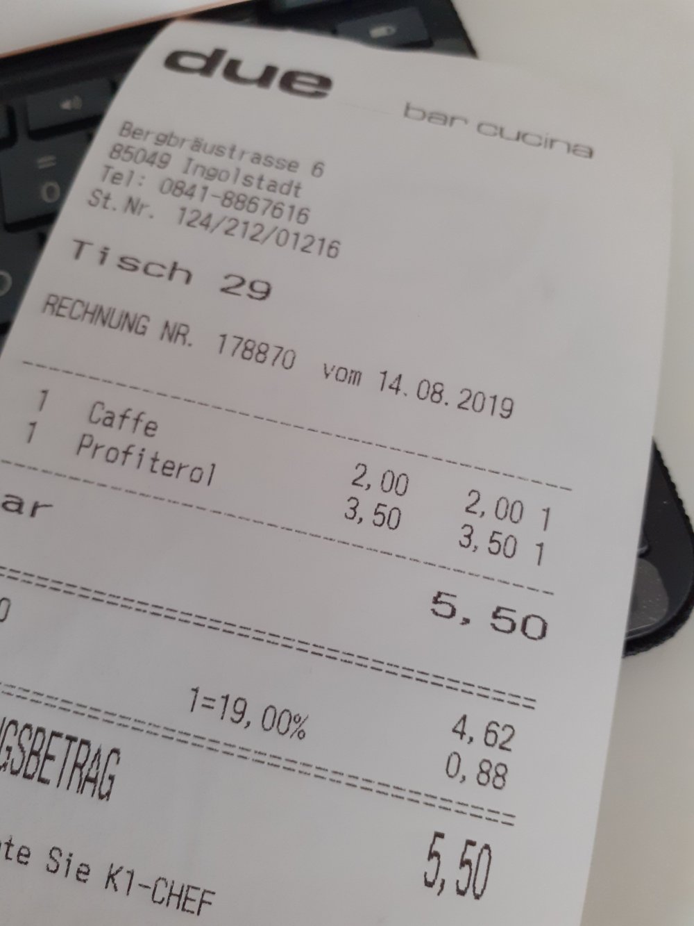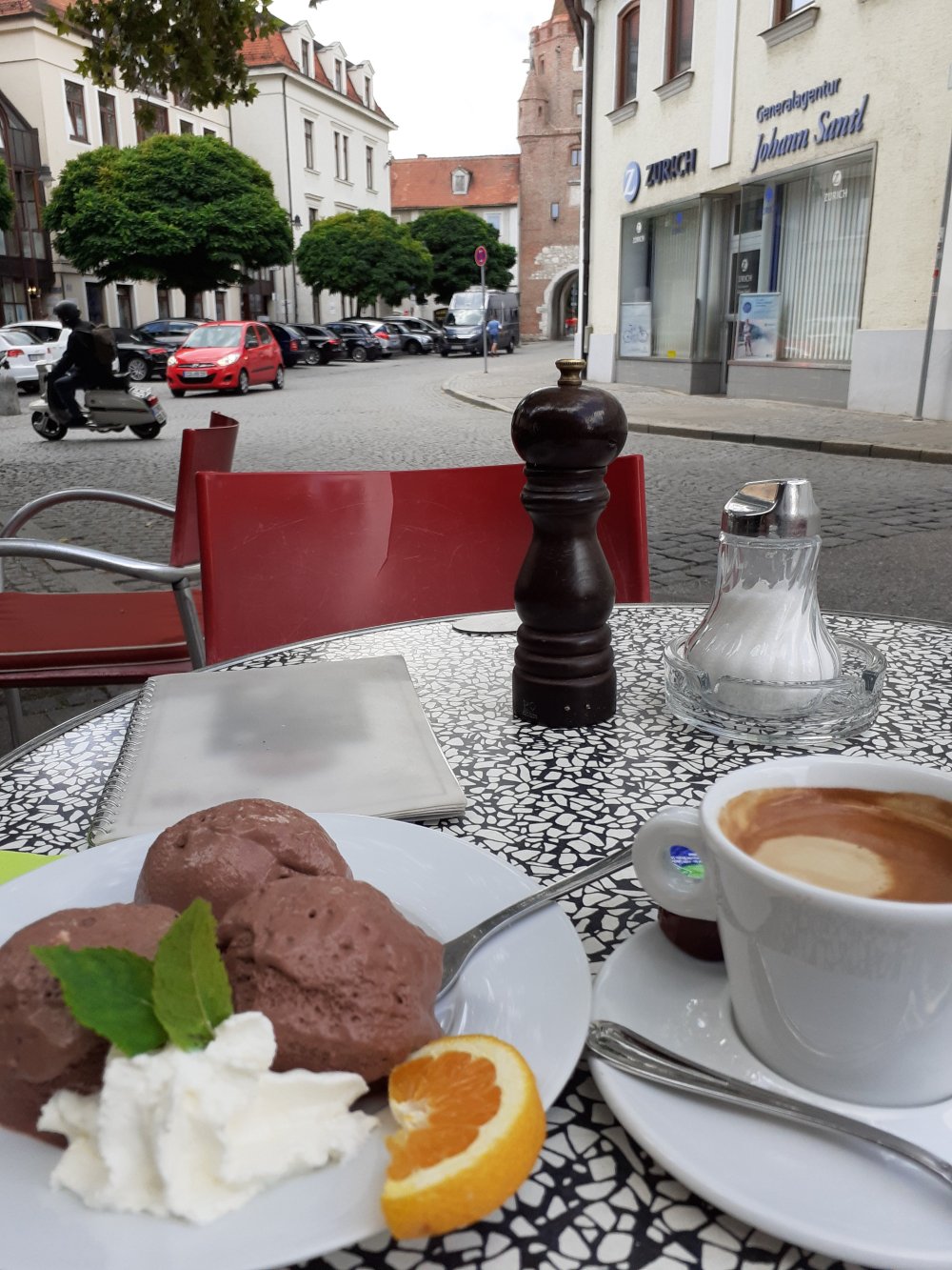インゴルシュタットでは実に有名なこのイタリアンcafeはうちから歩いて100mの所にある。小さいバーだけどちゃんとした食事もできるという話だ。今日は水辺で1時間5kmの散歩をしたあと甘いものが食べたくなったので入ってみた。